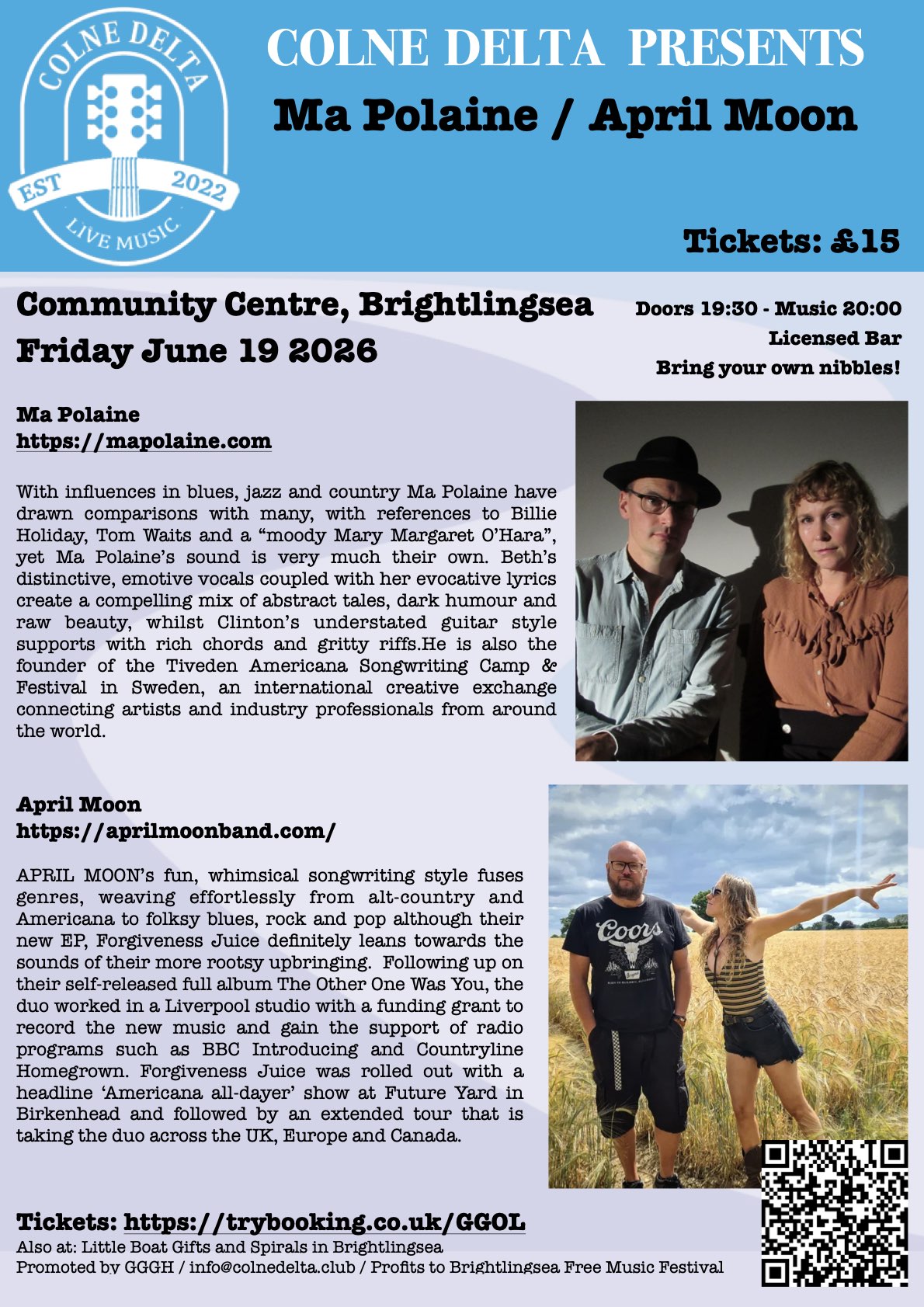 The Colne Delta Blues and Americana nights were created by Gary Gilders and Gary Hill, both veterans of the Brightlingsea Free Music Festival, to bring new (and old) music of a high quality to Brightlingsea.